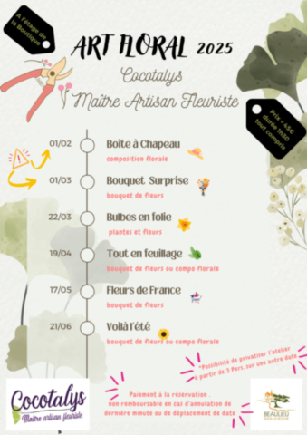 Les cours se déroulent un samedi par mois, ils débutent à 14h30 pour une durée d'environ 1h30. (matériel et fleurs fournis) (maximum 7 personnes) au prix de 45€.